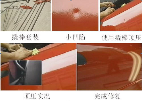 對(duì)于鋁板上的小凹陷,可以使用日照燈尋找凹陷點(diǎn),再用撬棒頂壓法,從板件內(nèi)側(cè)慢慢往外頂,但要注意不能過(guò)度頂壓,如圖1-91所示為撬棒頂壓法實(shí)例圖。