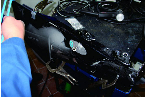 在鋁質(zhì)面板修復(fù)時(shí),也可使用鋁整形機(jī)對(duì)損傷部位進(jìn)行拉伸修復(fù),在經(jīng)整形機(jī)修復(fù)到位后,使用專用工具將螺紋介子齊根剪下,再打磨平整即可。對(duì)于鋼板車身來(lái)說(shuō),當(dāng)面板和內(nèi)層結(jié)構(gòu)同時(shí)發(fā)生變形時(shí),可以采取內(nèi)外層分離、分別修整,然后折邊咬合的修復(fù)方法。對(duì)于鋁質(zhì)面板,不能使用這種方法,否則由于鋁的韌度較差,折邊部位會(huì)出現(xiàn)裂紋或斷裂。