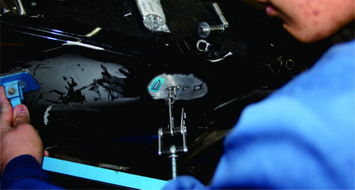 (8)相對(duì)于鋼板修復(fù),鋁質(zhì)車身板件更換的定位工作顯得更為重要。鋁質(zhì)車身粘接部位的粘接膠需要較長(zhǎng)的固化時(shí)間,為防止粘接膠在固化后車身尺寸產(chǎn)生位移或變動(dòng),測(cè)量后必須使用定位夾或通用夾具對(duì)更換部件進(jìn)行定位。