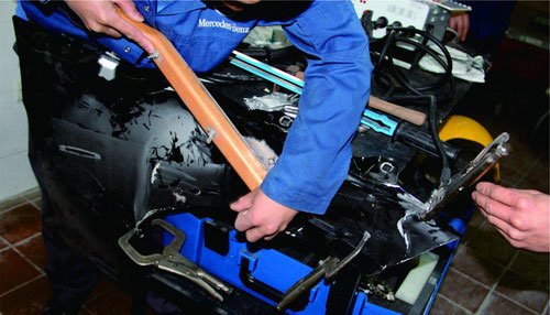 對(duì)鋁板的修復(fù),為了防止在校正中因敲擊過(guò)重而導(dǎo)致鋁板過(guò)度拉伸,一般應(yīng)使用膠錘、木錘,不能使用常規(guī)的鋼板整形工具。用鐵錘和墊鐵校正鋁板時(shí),應(yīng)注意以下兩點(diǎn):