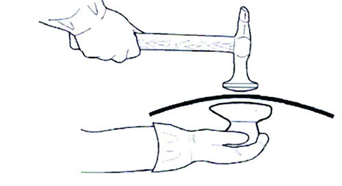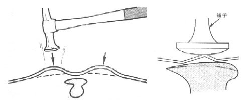 (1)為了降低拱起部位的高度,如果采用正托敲擊法,操作時(shí)應(yīng)多次輕敲,不能重敲,否則錘擊太重或次數(shù)過(guò)多會(huì)使鋁板延展拉伸,如圖1-89所示是正托敲擊法示意圖。