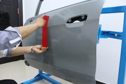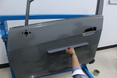 在40分鐘內(nèi),對(duì)雪佛蘭新賽歐左前門(mén)外板上的長(zhǎng)80mm,寬40mm,深10mm的條形凹陷(漆膜已破壞)進(jìn)行修復(fù),凹陷損傷穿過(guò)車(chē)身線。